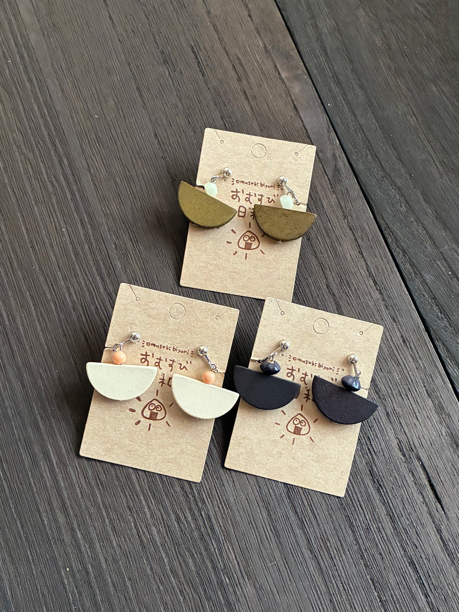優雅な半月をイメージしながら、かわいらしいさも持つデザインのイヤリング。「おむすび日和」のこのアイテムは、丁寧に手作りされています。普段のコーディネートにさりげない華やかさを添える特別な存在です!